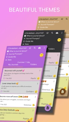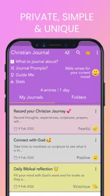 Wannan app ya wuce kawai rubutu; yana ba da damar yin amfani da muryarka don rubutu, sanya hotuna, da kuma keɓance littafinka da launuka da salo daban-daban. Za ka iya saita tunatarwa na yau da kullun don rubutu, kuma yana samar da daruruwan tambayoyin jagora don tunani mai zurfi, gano kanka, da sarrafa damuwa ta hanyar miƙa tunaninka ga Allah. Christian Journal - mood tracker, free gratitude journal and private Diary with a lock yana taimaka maka ka ga ci gaban yanayinka da rubutunka ta hanyar kididdiga. Hakanan, yana baka damar fitar da rubutunka zuwa PDF ko TXT don rabawa ko bugawa, kuma yana tabbatar da cewa an ajiye rubutunka lafiya. Babu tarin bayanai na sirri; sirrinka yana da tabbaci tare da Christian Journal - mood tracker, free gratitude journal and private Diary with a lock, wanda ke tallafa maka ka soke tunanin da ke ja da baya, ka maye gurbin tsoro da amincewa, da kuma rayuwa mafi kyau bisa tushen Allah.
