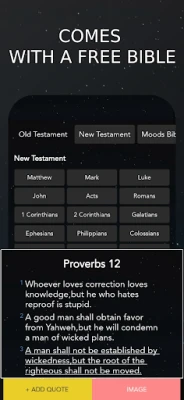 Baya ga tarin kalamai, manhajar tana ba ku damar ƙirƙirar naku hotunan kalamai na Littafi Mai Tsarki da na Kirista ta hanyar amfani da kyawawan hotunan baya da yawa. Hakanan, akwai kiɗan da ke daɗaɗa rai wanda zai taimaka muku samun nutsuwar ciki yayin karatun kalmomin Allah. Wannan manhaja ce mai cikakken bayani don tafiyar bangaskiyar ku, tana samar muku da kayan aiki don zurfafa fahimtar ku da Kalmar Allah. Adana ayoyin da kuka fi so, raba su ga abokanku da danginku, kuma bari koyarwar Littafi Mai Tsarki ta zama fitila ga tafarkinku a kowace rana.