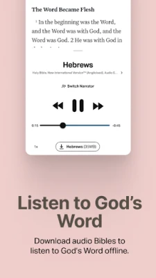 Kada kawai ku karanta; ku rayu da kalmar Allah. Tare da **Bible App Lite**, zaku iya sauraron Littafi Mai Tsarki tare da fasalin murya kyauta. Lura: Yana buƙatar haɗin intanet don sauraron sauti. Hakanan, manhajar tana ba ku damar ayyana (highlight) da adana ayoyinku da kuka fi so, don tunawa da mahimman darussa. Farawa kowace rana da sabon ƙarfafa ruhaniya ta hanyar "Ayar Rana", da kuma saduwa da Allah ta hanyar "Addu'ar Yau da Kullum". Hatta labaran Littafi Mai Tsarki masu daɗi suna nan don sauraro a kowane lokaci.