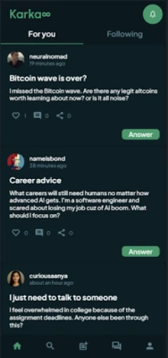 Tare da Karka∞, za ka samu abokin jagora mai amfani da fasahar AI wanda ke ba da shawara ta musamman, yana tunatar da kai a lokacin da ya dace, yana bibiyar ci gabanka, kuma yana taimaka maka lokacin da kake fuskantar kalubale. Ba wai kawai ga kanka ba, Karka∞ yana ba ka damar gayyato abokai ko haɗa kai da wasu masu irin burin ka. Kuna iya raba ci gaban ku, murnar nasarori tare, neman taimako, da kuma ƙarfafa juna don zama masu rikon amana a kan manufofin ku. Wannan tsarin zamantakewa yana sa cimma buri ya zama mai daɗi da ƙarfafawa.